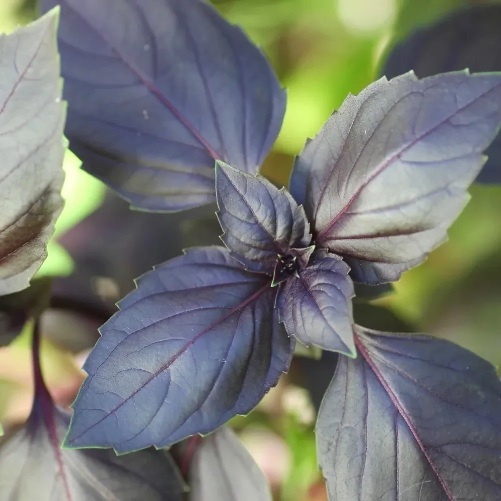 Le basilic pourpre ‘Dark Opal’ est une plante aromatique à port buissonnant et qui possède de larges feuilles de couleur rouge foncé.