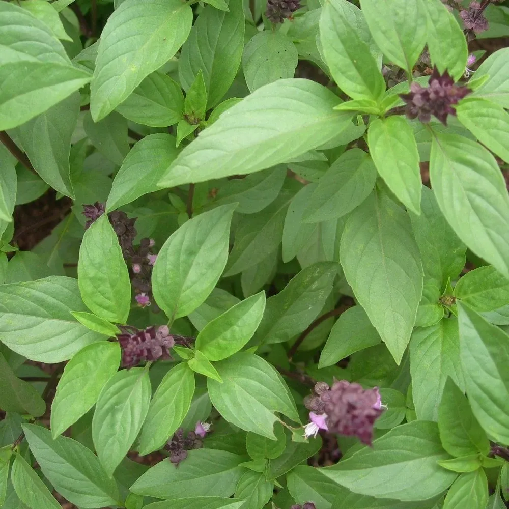 Ce basilic possède de grandes feuilles vertes striées de nervures pourpre. Cette variété de basilic est essentiellement utilisée pour les curry, les plats sautés et les soupes. Frais, il accompagne agréablement les salades et les nems.