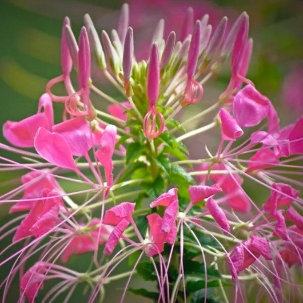 La Cléome ‘Pink Queen’ (Cleome spinosa) est une plante à fleur annuelle pouvant atteindre jusqu’à un mètre de hauteur. Ses superbes fleurs roses s’étale du mois de juin jusqu’à septembre. Elles forment de belles grappes roses à l’aspect étrange car les étamines, très longues, dépassent largement les fleurs et leur donnent un aspect échevelé. Cela lui a valu le surnom de « Plante-araignée ».