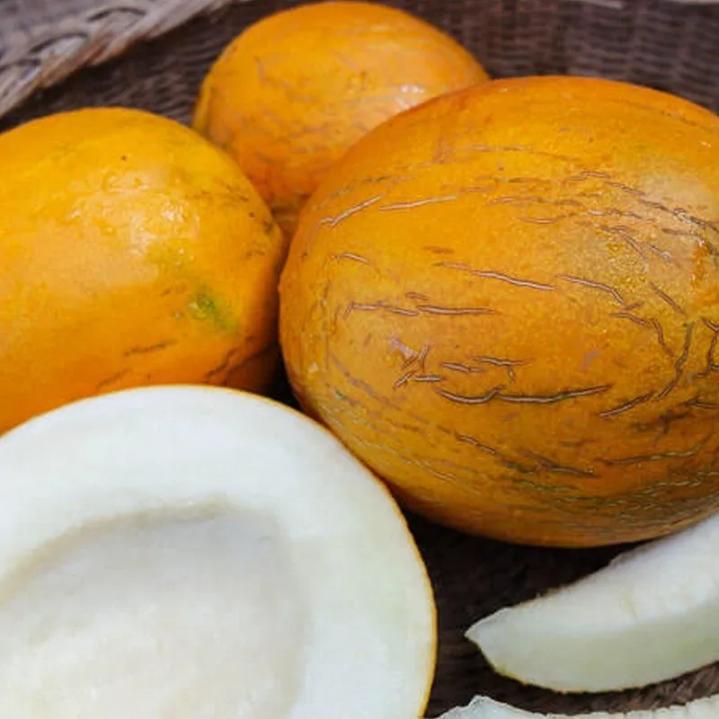 Le Melon Kazakh est une ancienne variété originaire d’Asie centrale et notamment du Kazakhstan. Ses fruits de 0,5 à 1,5 kg sont jaune vif à maturité complète et leur chair est totalement blanche. Sa texture est juteuse et sa saveur très agréable. C’est une variété précoce et très résistante à la sécheresse. Ne se conserve pas longtemps une fois mûr après récolte.