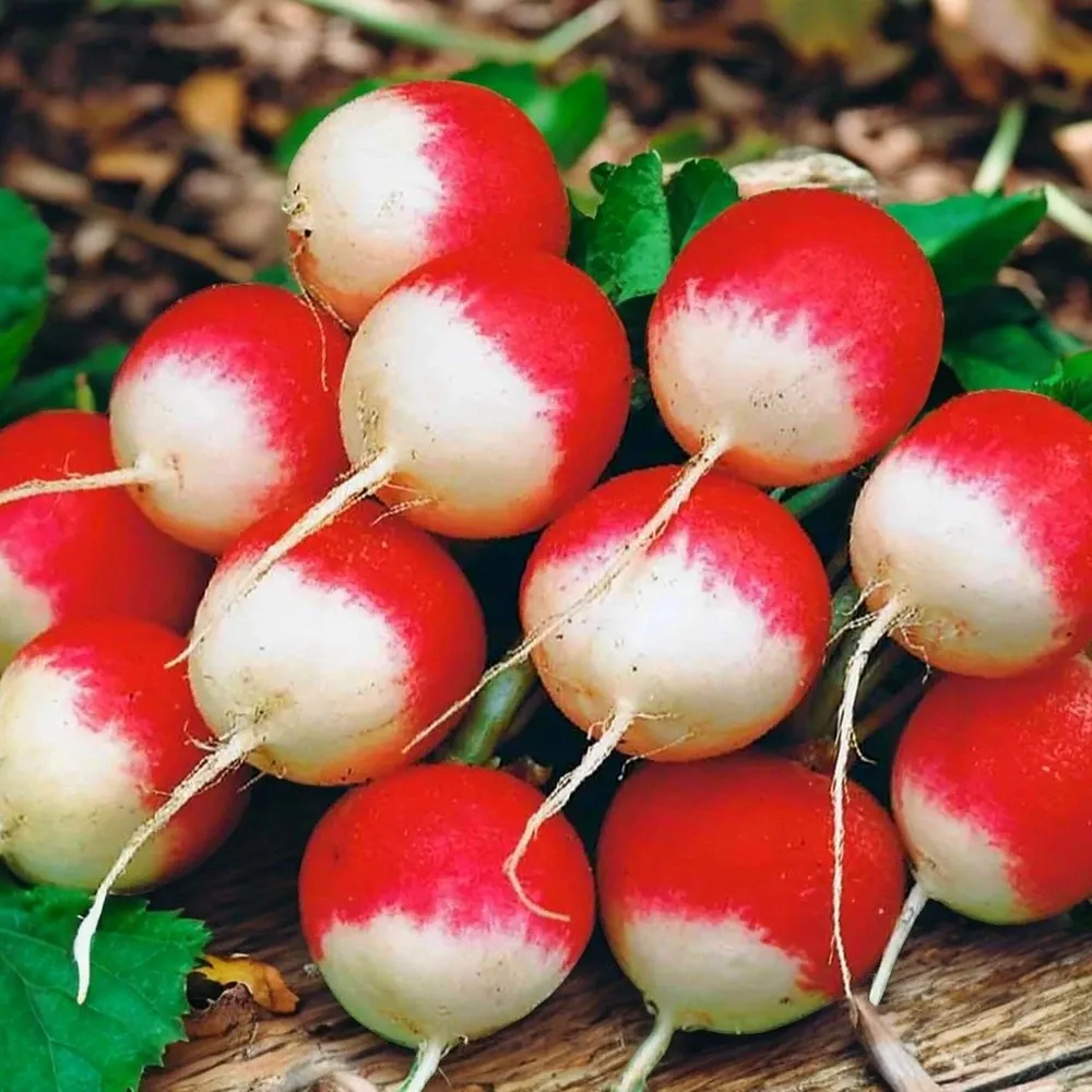 Le Radis rond ‘National’, une variété traditionnelle française, également connue sous l’appellation “Radis de France”. Cette variété se caractérise par ses radis ronds d’un diamètre moyen de 2,5 cm, arborant une couleur rouge carmin avec un bout blanc distinctif. Sa chair ferme et d’une blancheur éclatante en fait un choix de qualité pour les amateurs de radis.