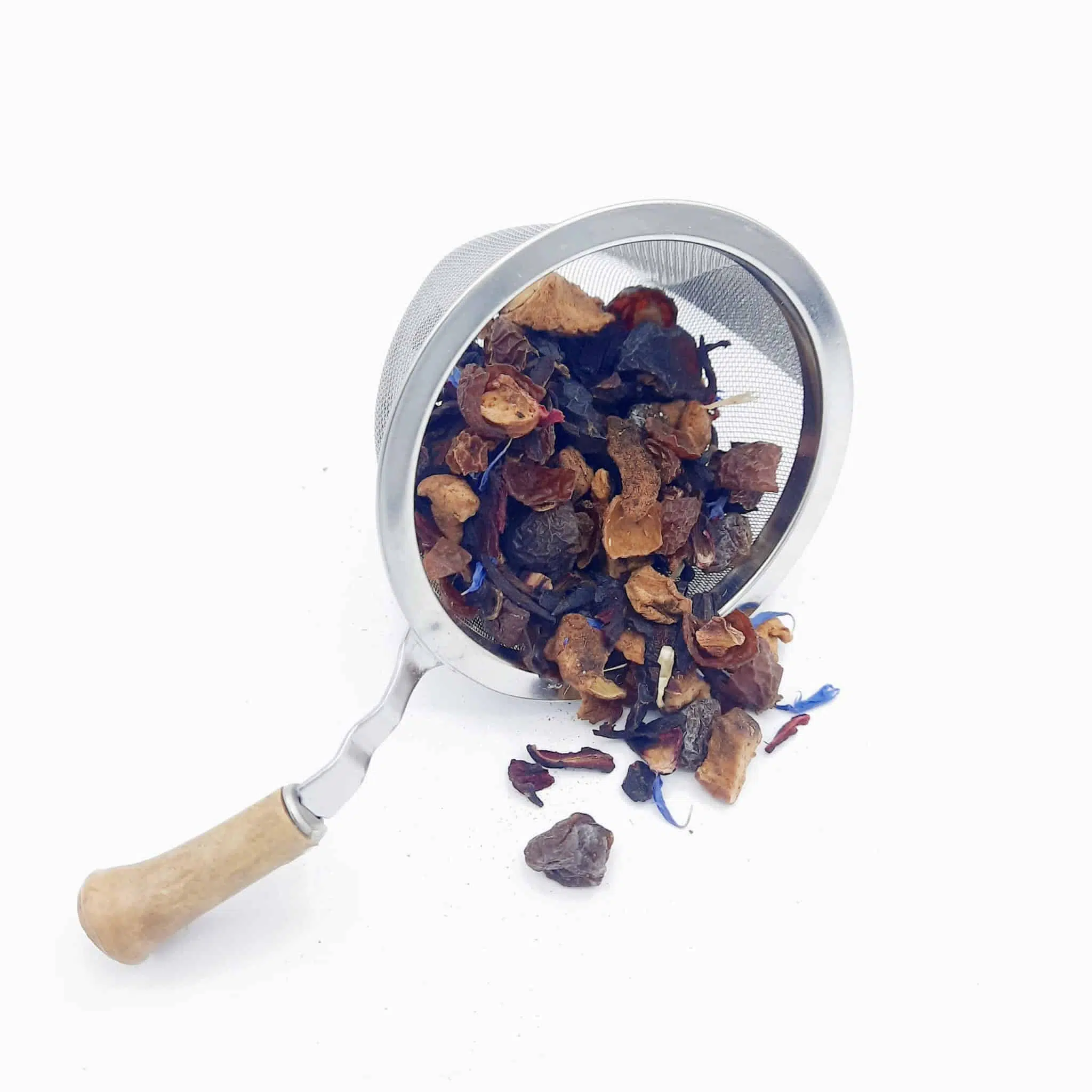 Ingrédients: Fleurs d’hibiscus, écorces d’églantier, morceaux de pomme, raisins, cassis, arôme, pétales de bleuet